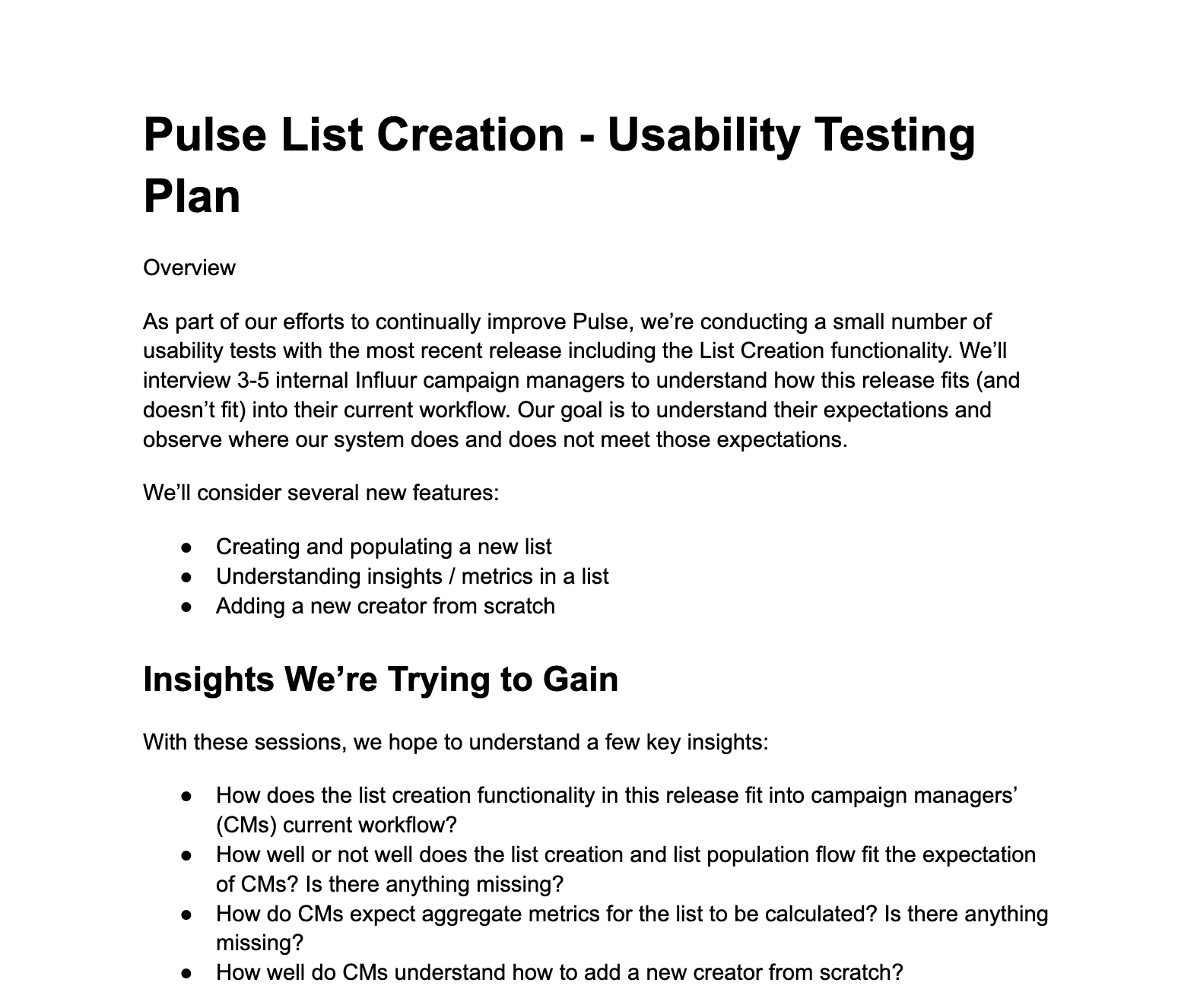 We used a task-based script to evaluate core flows (e.g., creating lists, adding/removing creators, checking metrics).