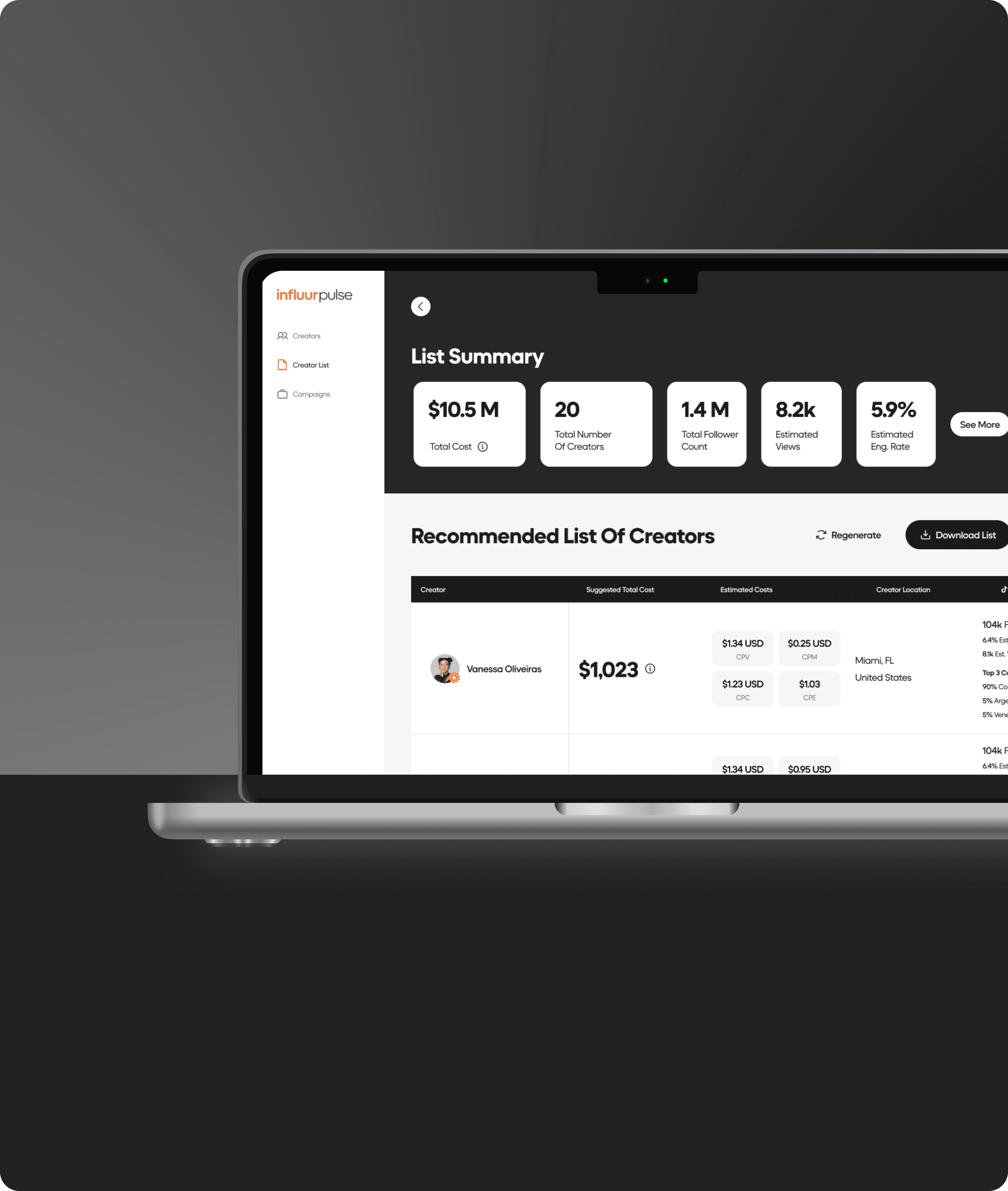 Add creator pricing, more flexible list building, prioritize creators with more followers.